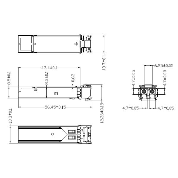 The transceiver consists of three sections: a DFB laser transmitter, a PIN photodiode integrated with a trans-impedance preamplifier (TIA) and MCU control unit. All modules satisfy class I laser safety requirements.